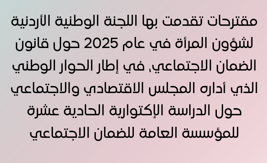 مقترحات تقدمت بها اللجنة الوطنية الأردنية لشؤون المرأة في عام 2025 حول قانون الضمان الاجتماعي، في إطار الحوار الوطني الذي أداره المجلس الاقتصادي والاجتماعي حول الدراسة الاكتوارية الحادية عشرة للمؤسسة العامة للضمان الاجتماعي