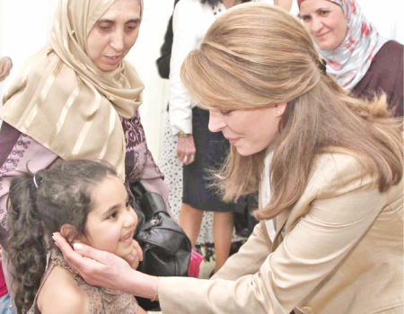 وجلالتها ومنذ وقت طويل مناصرة قوية للسلام العربي الاسرائيلي العادل ولقضايا اللاجئين الفلسطينيين، وهي عضو مجلس إدارة «اللاجئين الدولية» وهي صوت مناصر لحماية المدنيين في اماكن الصراع والتهجير في العالم. ولا يزال تركيزها منصبا على العراقيين المهجرين في كل من العراق والاردن وسوريا وبلدان اخرى بعد حرب العراق في العام 2003، وتعمل حاليا على مناصرة مئات الآلاف من السوريين المهجرين منذ اندلاع الازمة في سوريا العام الماضي.