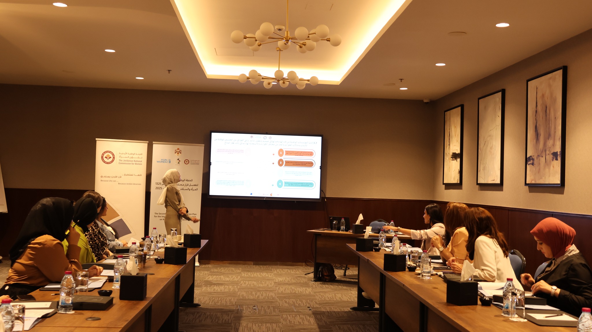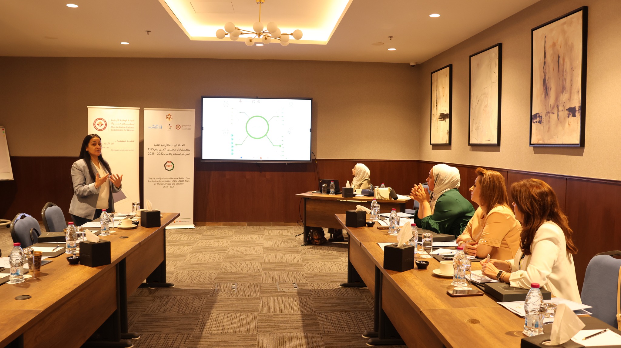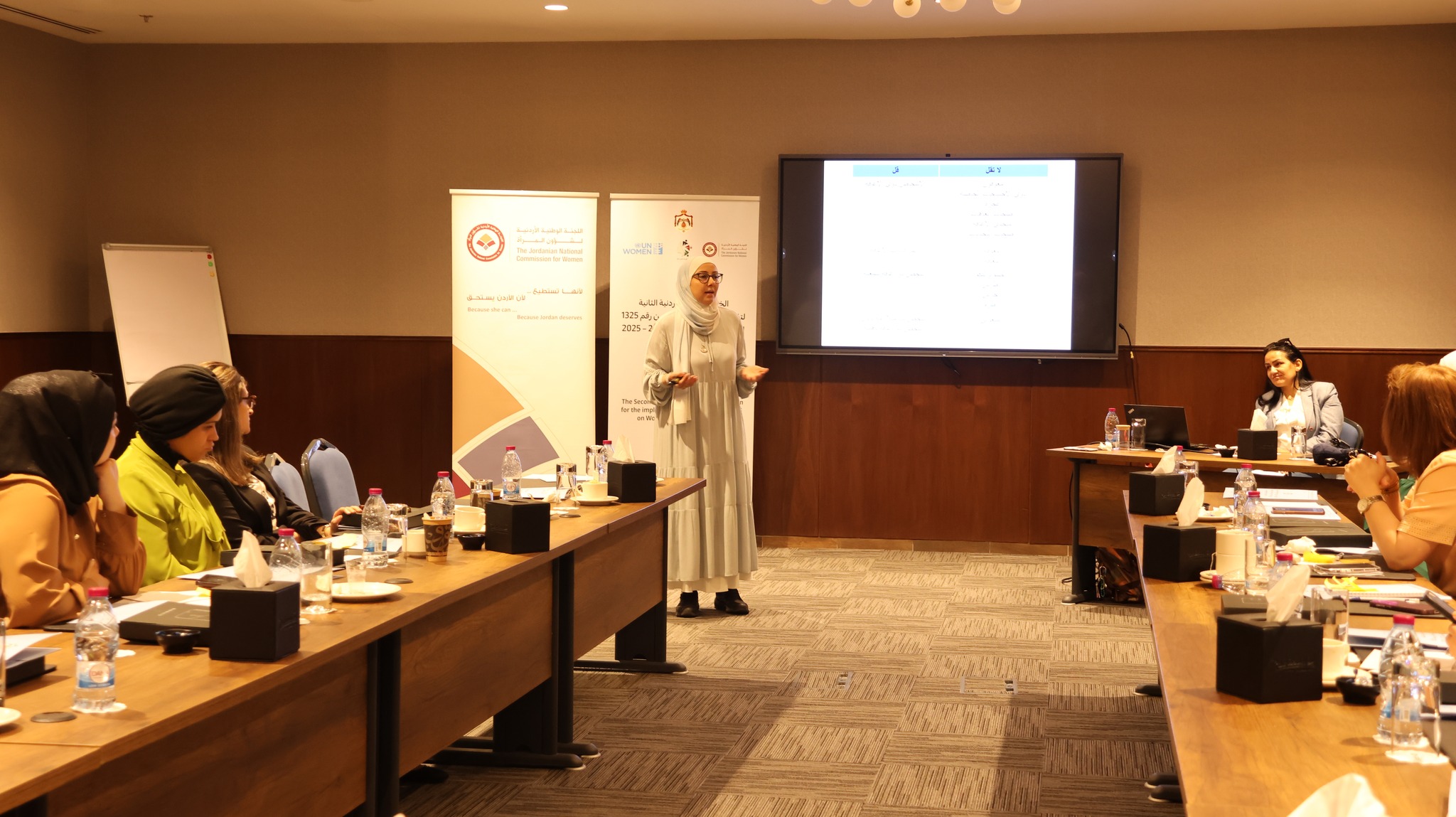 نظمت اللجنة ورشة عمل لفريق النتيجة الثانية ضمن إطار الحوكمة لضباط ارتباط المتابعة والتقييم لتنفيذ الخطة الوطنية الأردنية الثانية لتفعيل قرار مجلس الأمن ١٣٢٥ حول المرأة والسلام والأمن، المتعلقة بتعزيز مشاركة المراة بفاعلية في أطر صنع القرار للوقاية من الأزمات والاستجابة لها، وتغير المناخ وحالات الطوارئ بما في ذلك الكوارث الطبيعية والأوبئة والنزاعات المسلحة، وضمان مراعاة الاحتياجات المختلفة للجنسين.